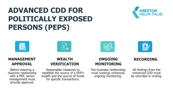 - Professional firms must apply enhanced Customer Due Diligence (CDD) for Politically Exposed Persons (PEPs), which include foreign PEPs, high-risk domestic PEPs, international PEPs, and even those who have stepped down. This also extends to their immediate family and close associates.